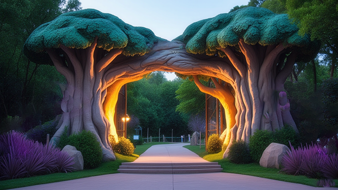 項(xiàng)目描述:在空曠的草原做生態(tài)園大門就像在大餐廳吃飯一樣,感覺一切都是小的,為體現(xiàn)生態(tài)園大門的氣勢,就要把生態(tài)園大門做得大,除了加大樹的高度、直徑,另外減少了樹枝樹葉,使整個(gè)樹形顯得頗具力感。我們所要做的就是不加大生態(tài)園大門尺寸的前提下讓生態(tài)園大門顯得高大。